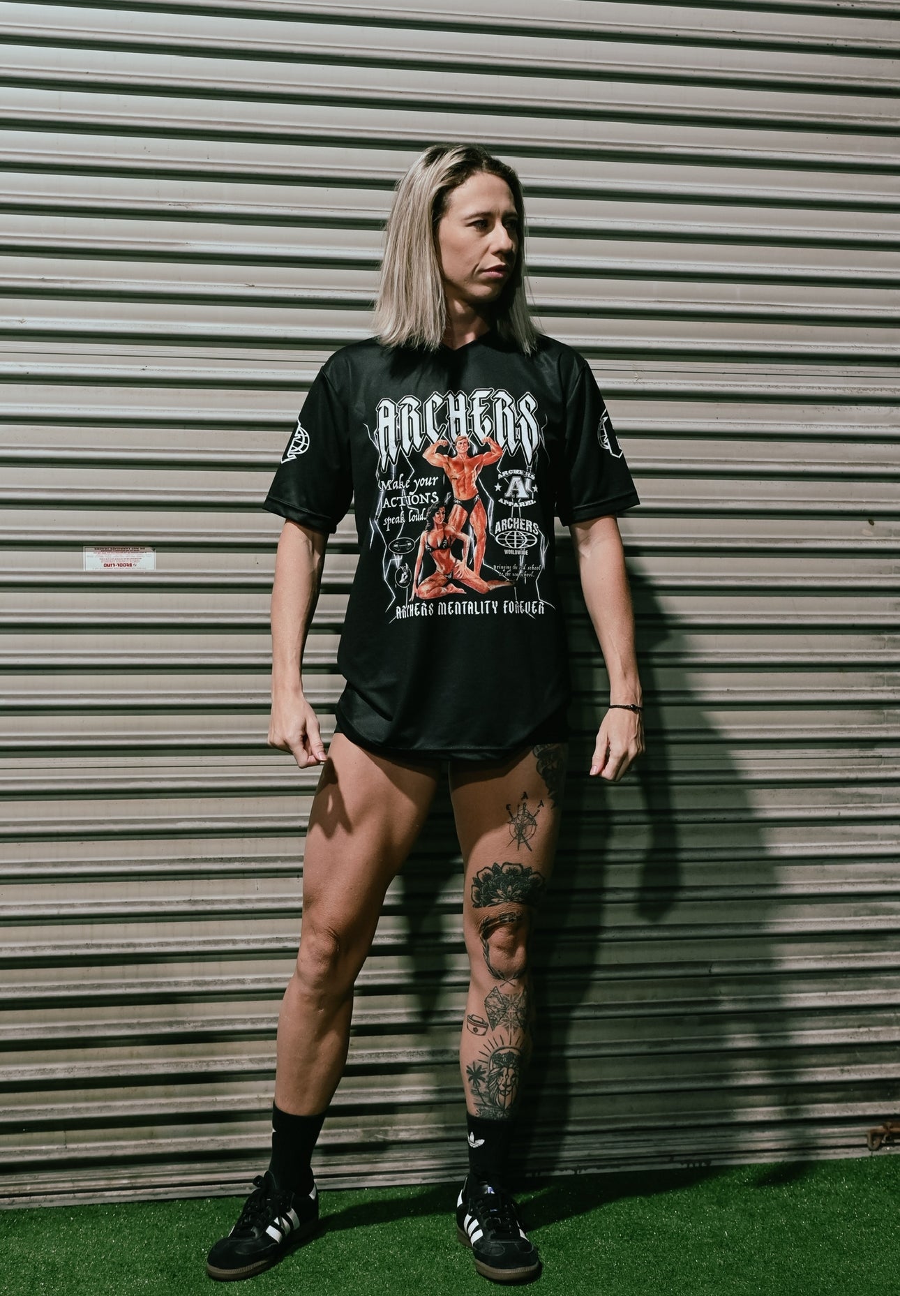 - Male Model 6'2" 105kg wearing XXL, Female Model 5'8" wearing a medium.